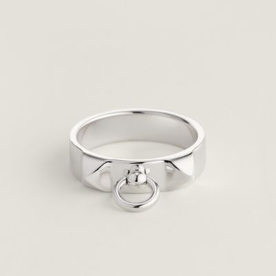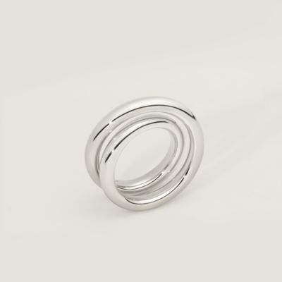 Sculptures of light, Hermès silver rings dress the hand with architectural boldness. Solid silver, the House's material of choice, morphs to revisit our historical codes. Find the iconic marine link through our rings from the [Chaîne d'ancre] collections, or prefer the contemporary and clean lines of the Osmose collection. Each creation plays on volumes, full and empty spaces, offering a timeless style signature and unique lunar brilliance.