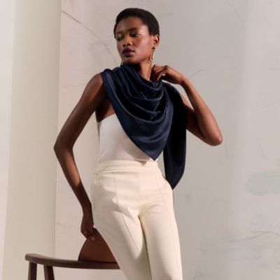 Delve into the colorful, ethereal and sensory world of Hermès scarves. Countless ways to style: The Maison's emblematic silk scarves are best accessorized using scarf rings, while larger Hermès shawls can be knotted to reflect your creativity. Whether draped around your neck or tied in your hair, glistening rectangle silk scarves and Hermès bandanas offer infinite possibilities to express your style with a touch of effortless elegance.