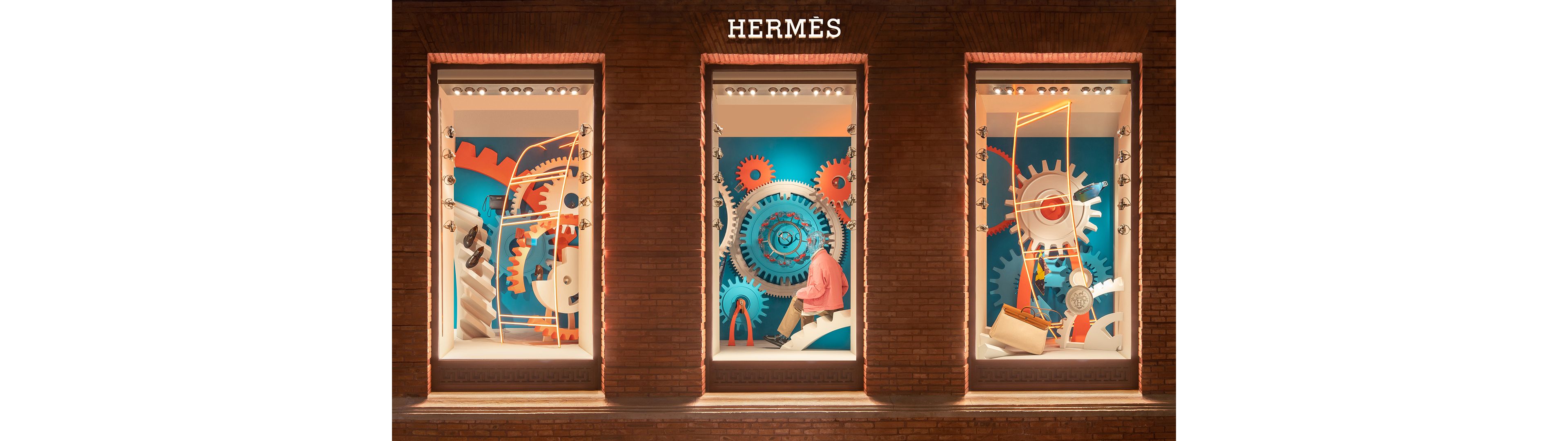 The artist used spheres, minimalist lines and bright colours to create a set of planets and atoms, and mechanical cogs illustrate innovation through technical know-how and progress. Hermès objects link the different cogs, as a symbol of the time spent in the making process.