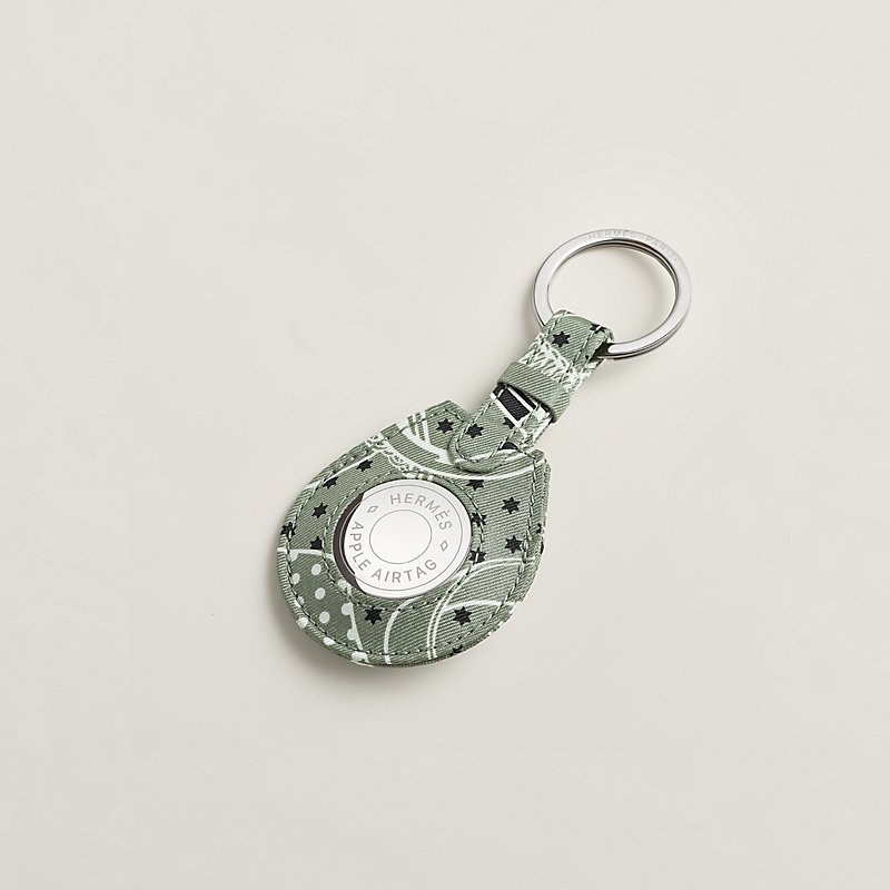 Apple AirTag Hermès key ring in silk featuring the graphic elements of the Bandana Eperon d'Or silk scarf.