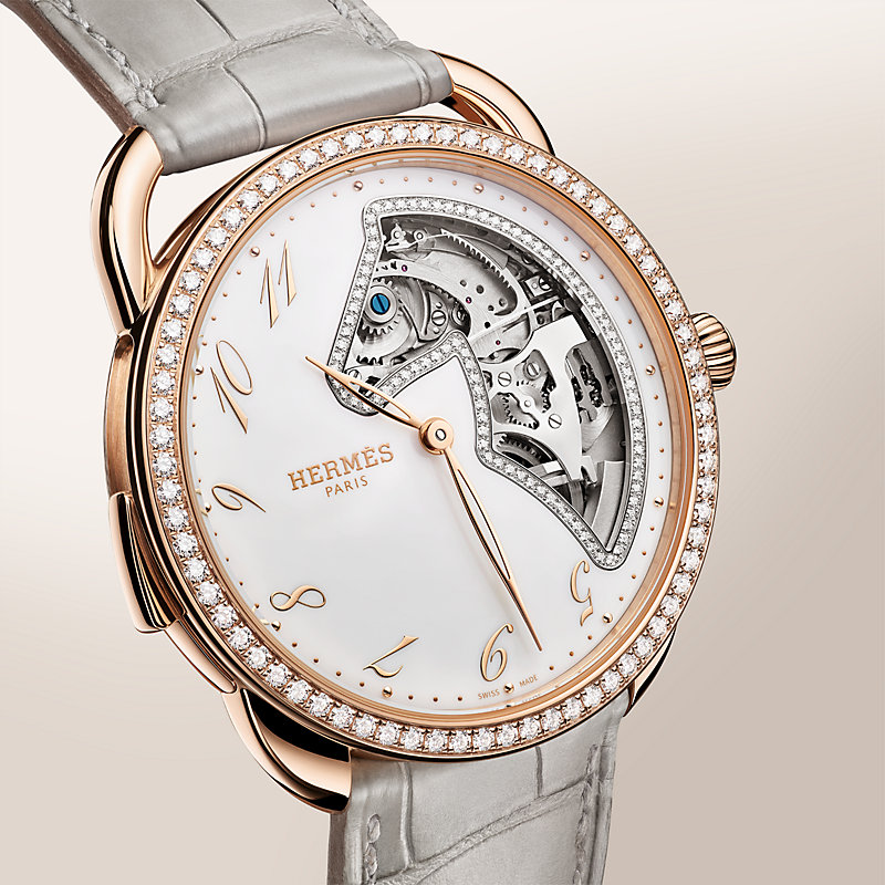 Diamond-set rose gold watch, Hermès Manufacture movement H1927, dial in Saint-Louis crystal, short interchangeable strap in matte pearl grey alligator
