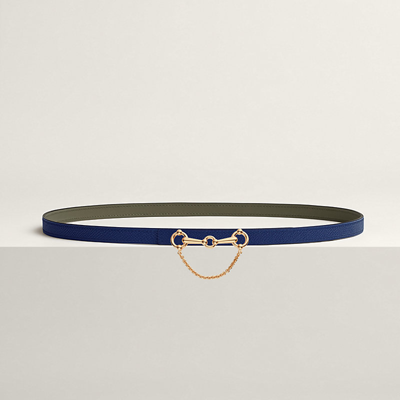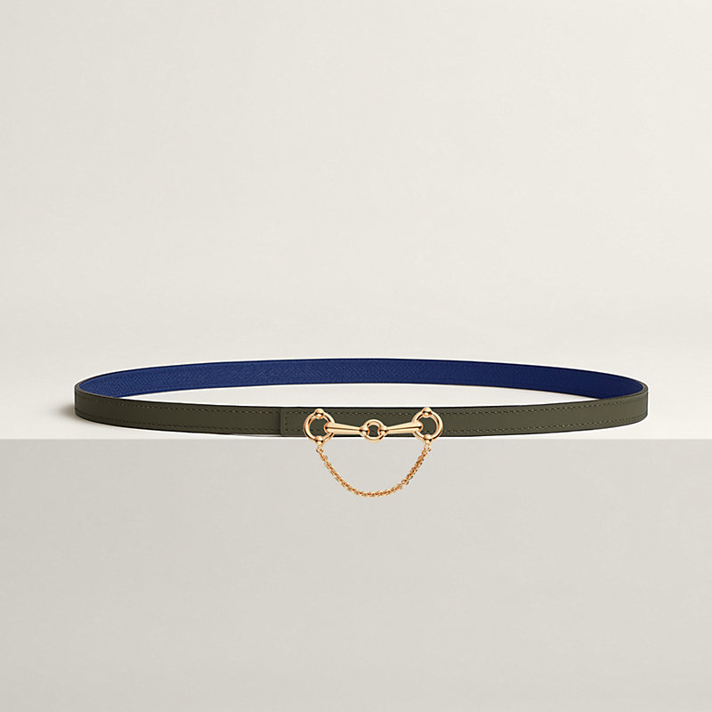 This belt buckle, with its sleek and contemporary design, takes the shape of a horse bit and belongs to the equestrian world that is so dear to Hermès heritage. The chain adds movement and places this product within the fantasy segment.