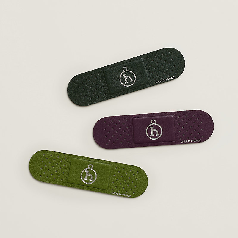 This set of three reusable patches protects all of your everyday items. Each patch is intended to be decorative and evokes the idea of an object that has been repaired and made to last – in keeping with the spirit of petit h. Chosen for its softness and suppleness, the lambskin uses elements from the patch: the leather is perforated on the ends and two tabs protect the adhesive before application. It represents an invitation to repair glasses, conceal a defect, hang up photos and romantic messages, or simply to close a bag in style.