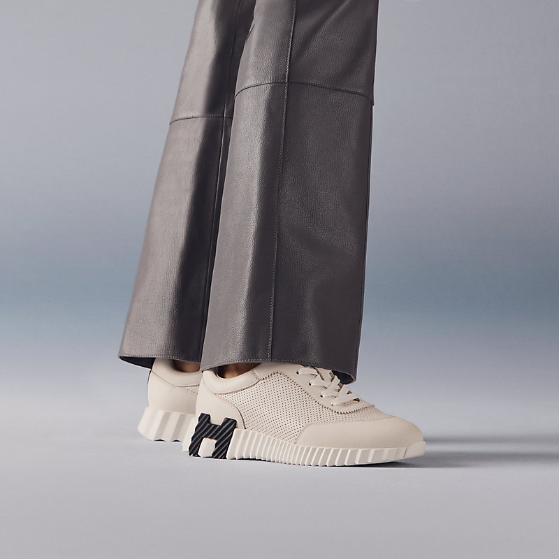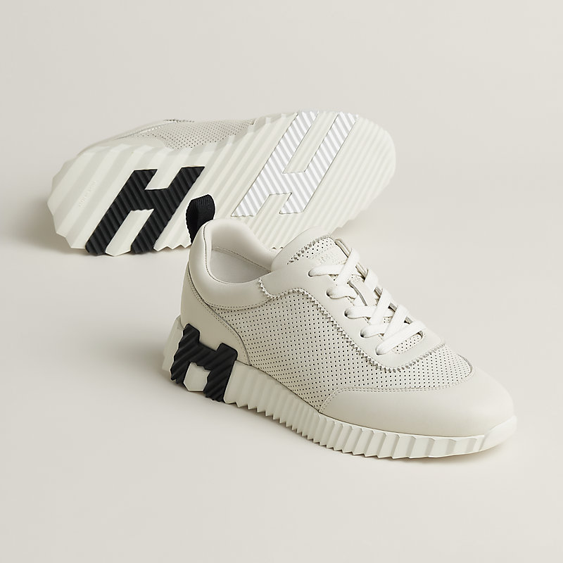 Showing a clean pair of heels, the Bouncing sneaker ventures into urban effervescence. So light that it no longer appears to touch the ground and full of untamed energy, it turns every moment into a high-speed adventure. Thinking big, it features a signature "H en biais" motif in a bold, oversized format.