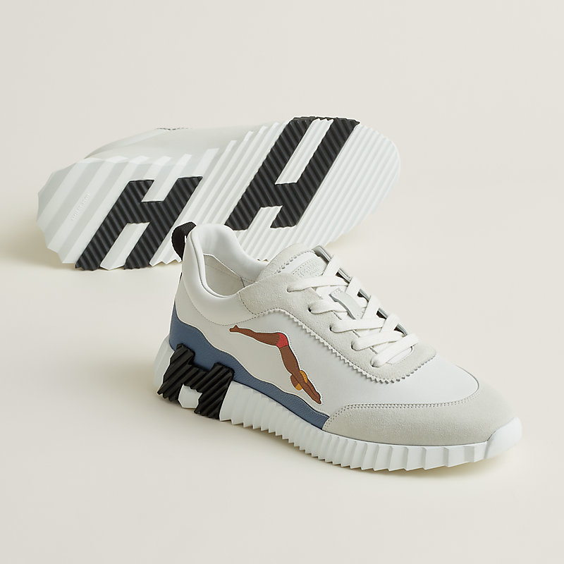 Showing a clean pair of heels, the Bouncing sneaker ventures into urban effervescence. So light that it no longer appears to touch the ground and full of untamed energy, it turns every moment into a high-speed adventure. Thinking big, it features a signature "H en biais" motif in a bold, oversized format.