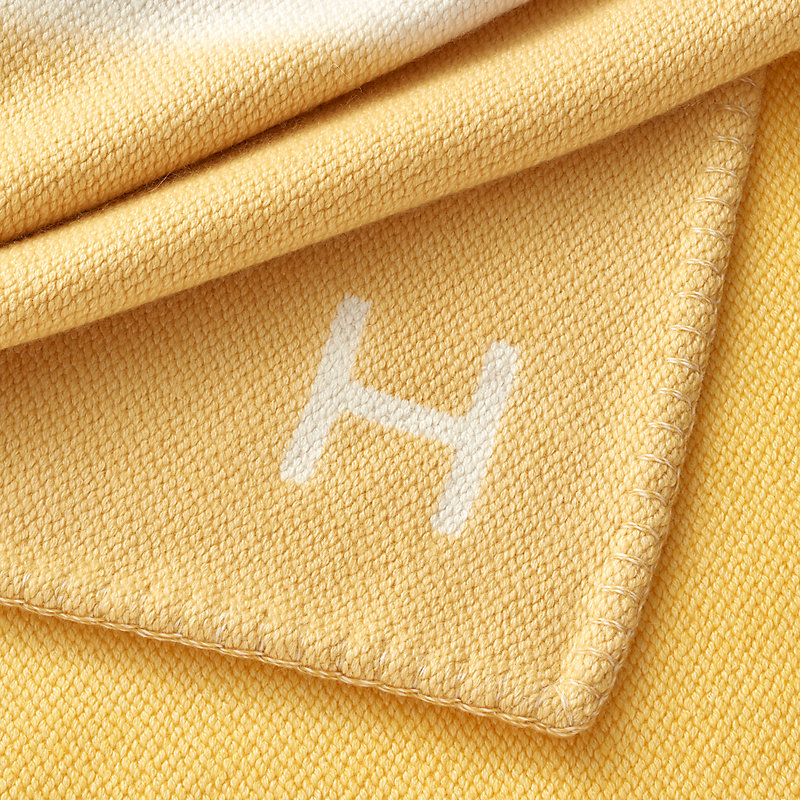 The "H" detail is created by applying a wooden "H", carved by hand and affixed to the blanket before it is soaked in the dye baths to avoid infusing the vaporous cashmere.