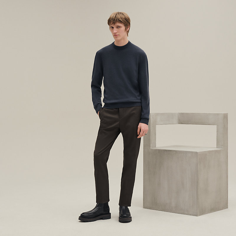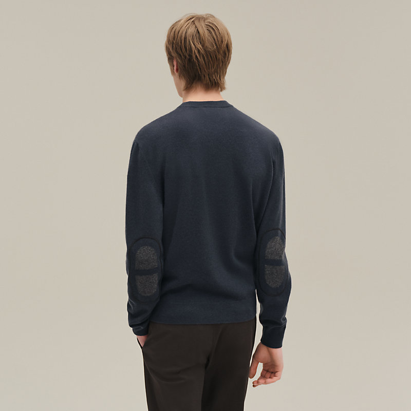 A Hermès best-seller, this timeless sweater is woven from our signature cashmere: fine, soft, warm and of exceptional quality. Hermès' iconic Chaîne d'Ancre motif embellishes the elbow patches, which are themselves adorned with a contrasting lambskin leather detail. This signature sweater will keep you warm and looking elegant over the winters.