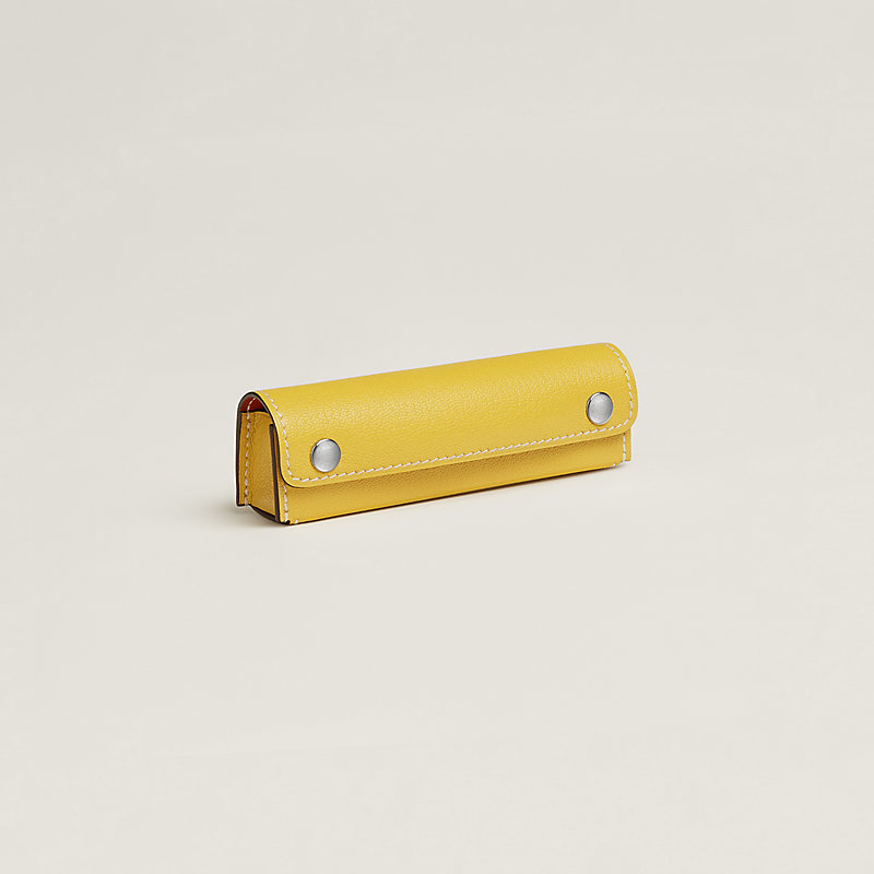The Chance dice case joins the games collections, offering a host of new playing options to carry wherever you go. The case contains five boxwood dice adorned with ebony dots created in wood marquetry. The glossy Chamkila goatskin exterior contrasts with the soft lambskin interior, creating a two-color case that plays on bright shades and materials. Its orange box is designed to double up as a dice tray, complete with a felt playing surface and a score book. It's your turn to play!