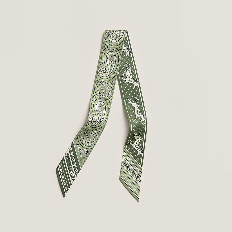 Inspired by the wrought iron of a 19th-century farrier's sign from a catalog in the Émile Hermès collection, Daiske Nomura sets the heart of this cheerful scarf racing. With starry coats and horseshoes, the horses gallop faster than the Bandana motifs around them. A lucky charm you can tie around your neck.