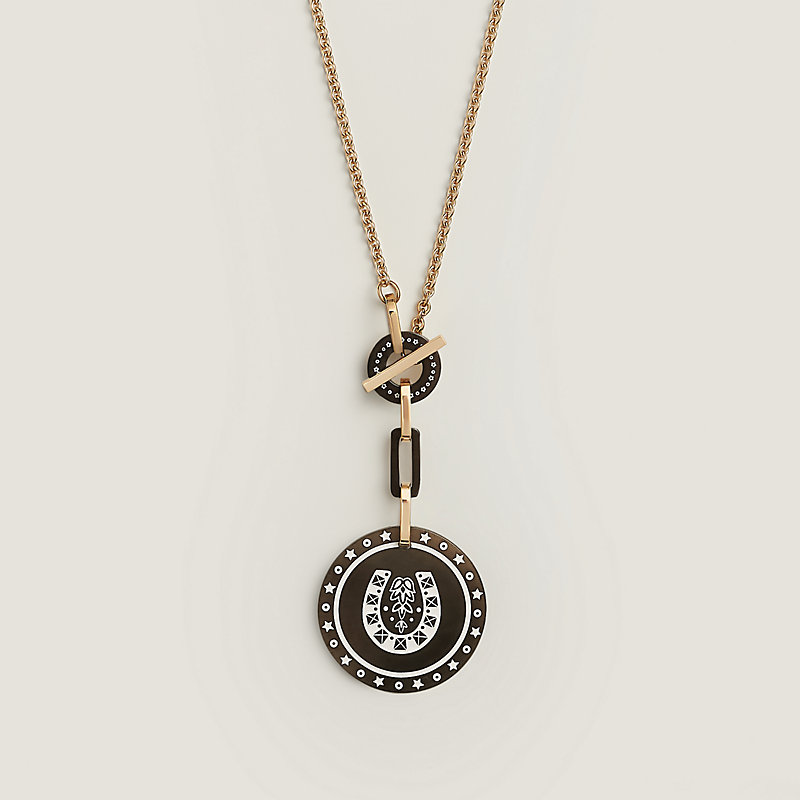 Pendant in lacquered horn and metal, engraved on both sides.