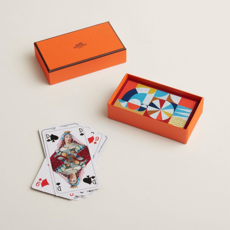 The idea for "Cheval Natte" came to Tong Ren when he was designing the "Mon Premier Galop" shawl. The two designs share the same visual aesthetic: the texture of the braiding and color blocks. "Cheval Natte" was inspired by the wooden blocks the artist used to build castles when he was a child. The horse is standing on the stage, the curtain open and the lights on. He is ready to open the show. This playful, cheerful design is featured on the new poker, bridge and tarot playing cards.