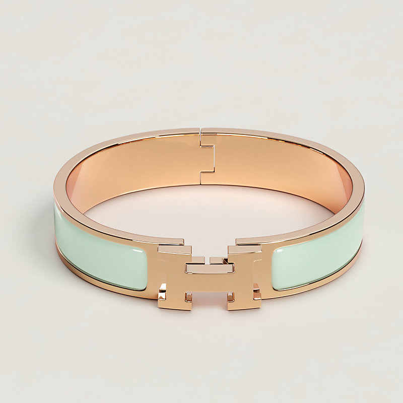 To open and close your Hermès bracelet, follow these three steps. 1. Carefully slide it over your wrist. 2. Push both ends together to close. 3. Rotate the "H" of the clasp until straight. And Click!
