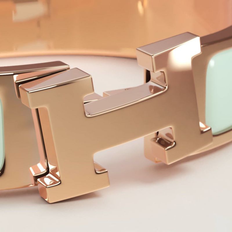 To open and close your Hermès bracelet, follow these three steps. 1. Carefully slide it over your wrist. 2. Push both ends together to close. 3. Rotate the "H" of the clasp until straight. And Click!