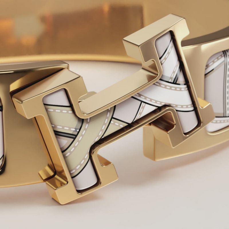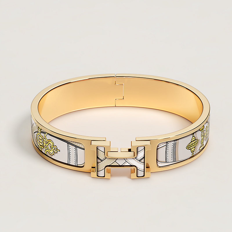 To open and close your Hermès bracelet, follow these three steps. 1. Carefully slide it over your wrist. 2. Push both ends together to close. 3. Rotate the "H" of the clasp until straight. And Click!