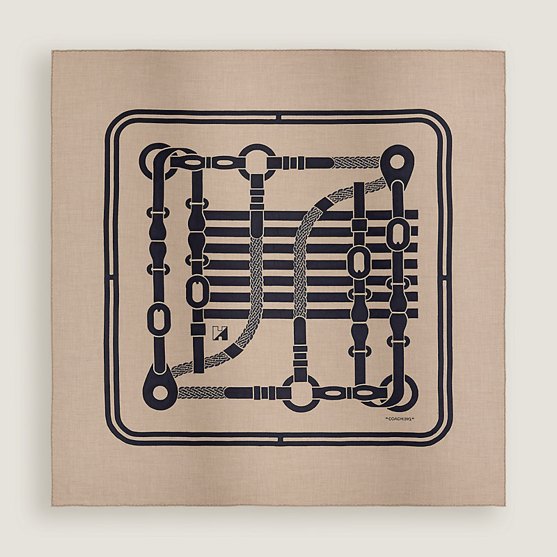 This design is composed of different elements used for harnessing a horse. It depicts Hermès' original expertise as a harness maker, as well as the elegant equestrian world for which the Maison has become renowned. The background features a blanket lined with a wide wool braid. In the lower right and upper left corners, dress sheets are revealed: blankets which are thrown over horses after exercise or racing to protect them from the cold. In the 17th-century, coaches were imposing horse-drawn carriages driven by coachmen that transported passengers and luggage.