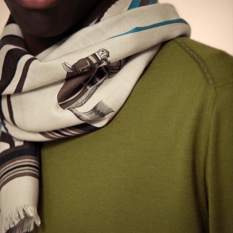 Stabled, waiting or showing, the horses change for each of the day's events. In his 1962 Couvertures et Tenues de Jour scarf, Jacques Eudel drew a few examples of these blankets, sheets and camails, featuring their owners' colors and numbers. Presented in this rectangle format, the array has been broken down into a playful, graphic checkerboard with stripes and squares that seem to point the horses in the right direction.