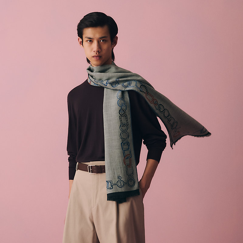 Straight out of a catalogue in the Émile Hermès collection, the buckles that danced across Florence Manlik's scarf stand at attention at the four corners of this rectangle. All except two latecomers who have clearly lost at musical chairs.