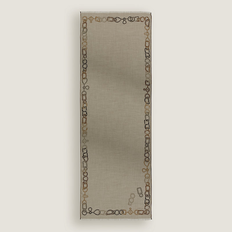 Straight out of a catalogue in the Émile Hermès collection, the buckles that danced across Florence Manlik's scarf stand at attention at the four corners of this rectangle. All except two latecomers who have clearly lost at musical chairs.