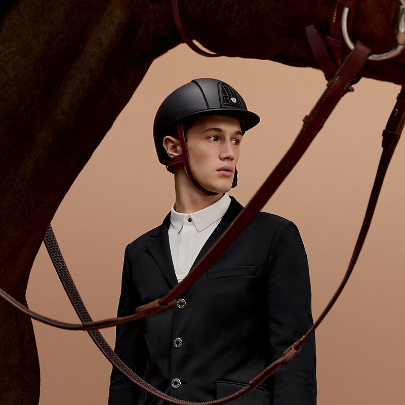 Riding helmet in polycarbonate with standard visor and chinstrap in red Zermatt calfskin: