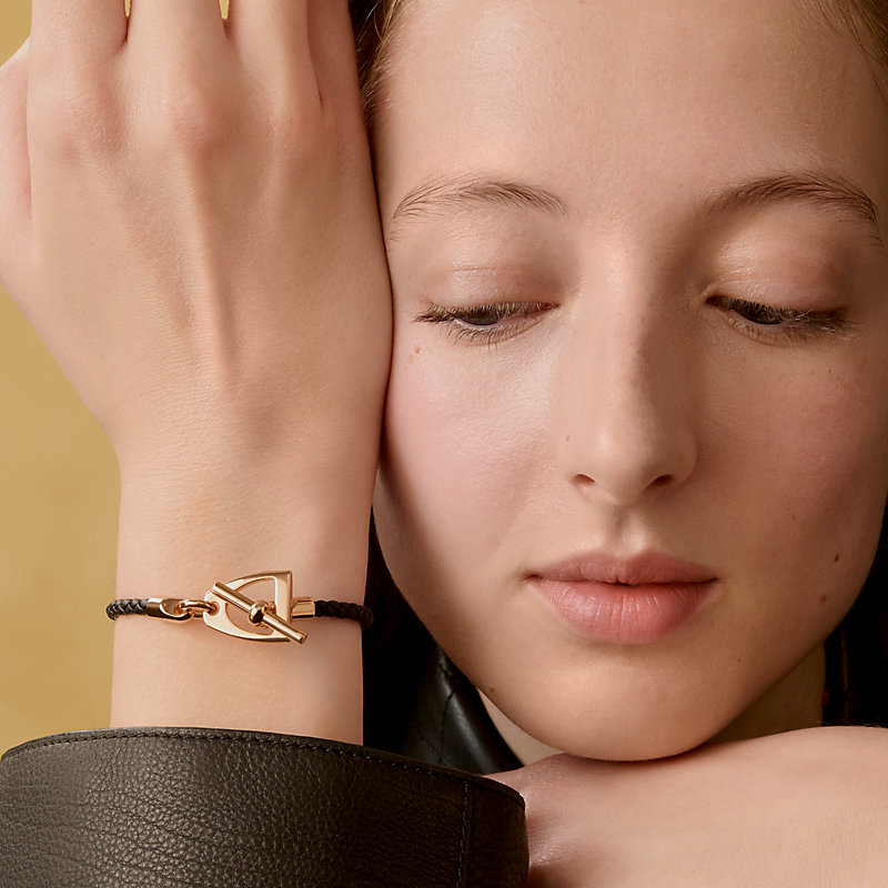Braided bracelet in Swift calfskin and metal, with stirrup clasp inspired by Hermès' equestrian heritage.