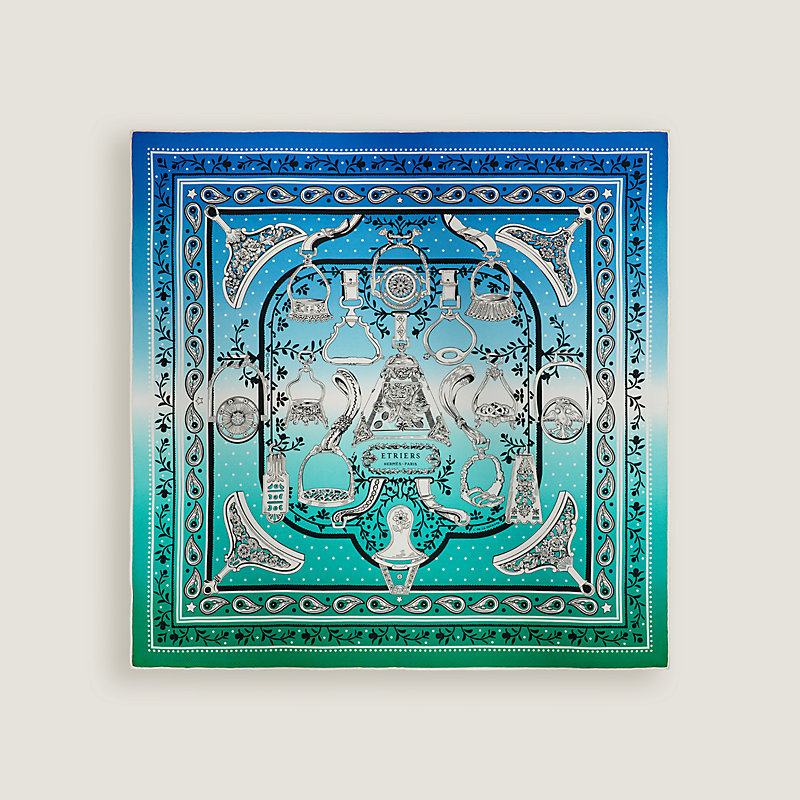 For her original design, Françoise de La Perrière drew inspiration from the works in the Émile Hermès collection, which includes many harness pieces. Featuring a collection of stirrups dating from the 18th and 19th centuries, the designer takes us on a journey from South America to the Middle East via Europe. Elegantly crafted flowers, constellations, and legendary animals complement the droplets, stars and dots of the bandana pattern that frames them. A revisited memory of a past whose splendor is reflected in the beauty of each object.