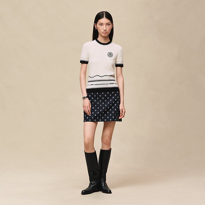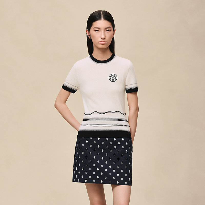 Short-sleeve sweater in cashmere knit with "Ex-Libris" jacquard motif (98% cashmere, 1% polyamide, 1% polyurethane)
