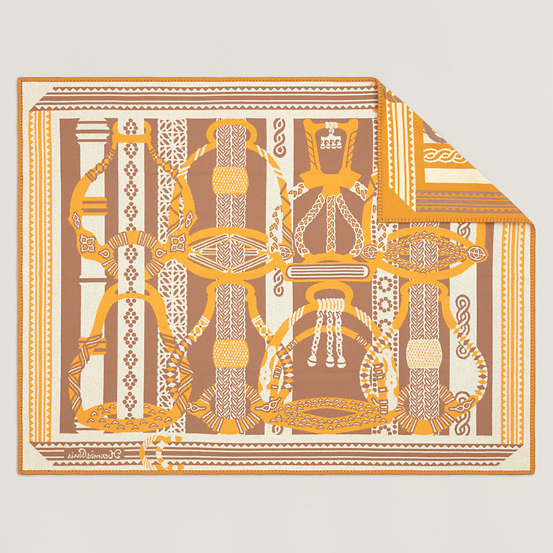 Fantaisie d'Etriers presents the folkloric wardrobe of a whimsically elegant rider designed by Virginie Jamin. Stirrups and stirrup leathers appear in simplified shapes to create a graphic, colorful composition. Taken from the Emile Hermès collection of peddler's albums, these riding accessories intertwine curves, loops, braids and twists to create luminous effects.