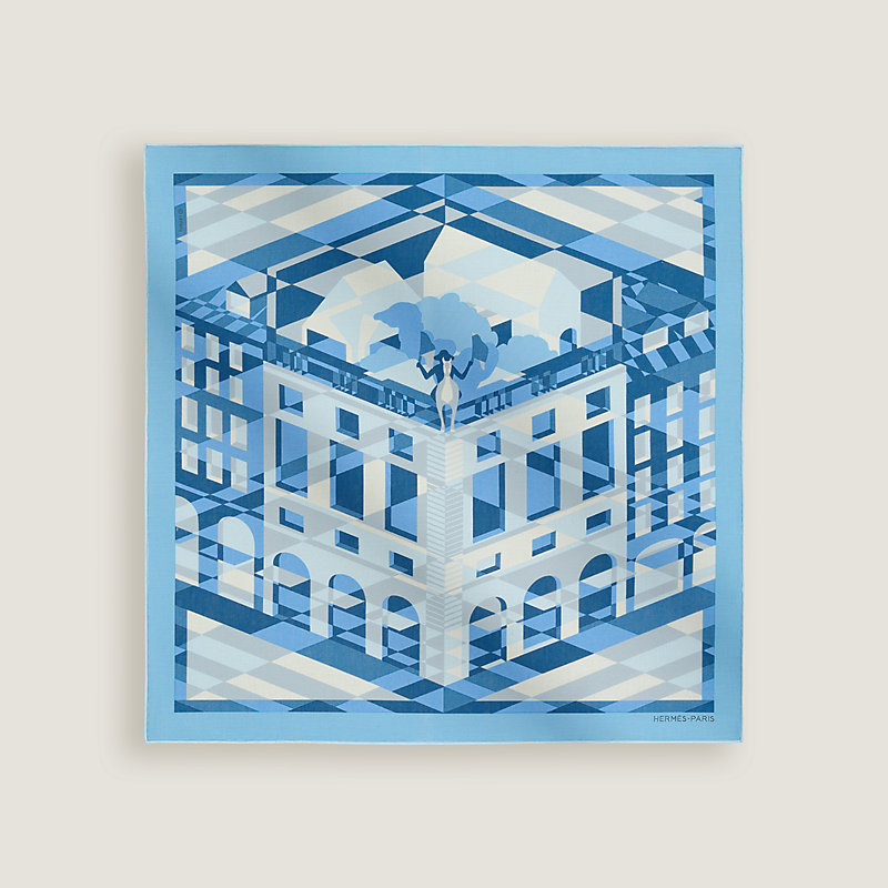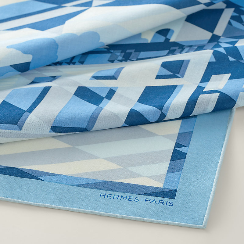 Handkerchief in cotton with "Faubourg en Perspective" print by Anamorphée and hand-rolled edges. Signature "Hermès Paris"