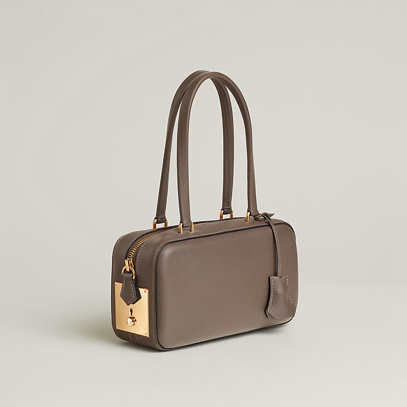 Inspired by the silhouette of a travel bag, the Faubourg Express bag pays tribute to the iconic 24 Faubourg Saint-Honoré store, the theme of 2024, while also honoring the Maison's heritage. Its gold or silver-finished lock draws inspiration from the intricate mechanisms and fine craftsmanship of the Plume bag and the archival Quirus model. The bag's minimalist design and defined structure reveal the sophisticated craftsmanship of the master saddler and leatherworker: mold assembly, seam-joining on the handle, and clasp beading. A highly contemporary bag in two sizes, designed to be worn over the shoulder or on the arm, ensuring an elegant silhouette for everyday wear.