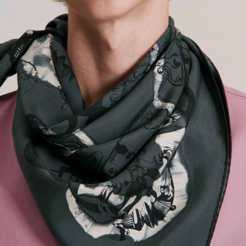 In France, between the 17th and 18th centuries, wrought-iron craftsmanship thrived, embracing all forms of decorative fantasy. Palms, fleurs-de-lis and animals now bring gates, doors and fountains to life, inspired by the lion's head door-knocker from the Emile Hermès collection, which Caty Latham has placed at the center of her composition. And when a silk ribbon is entwined around the finely printed metalwork, the metal seems to gracefully dance. Reinterpreted with a tie-dye effect, the design, which was first released in 1970, is now more contemporary than ever.