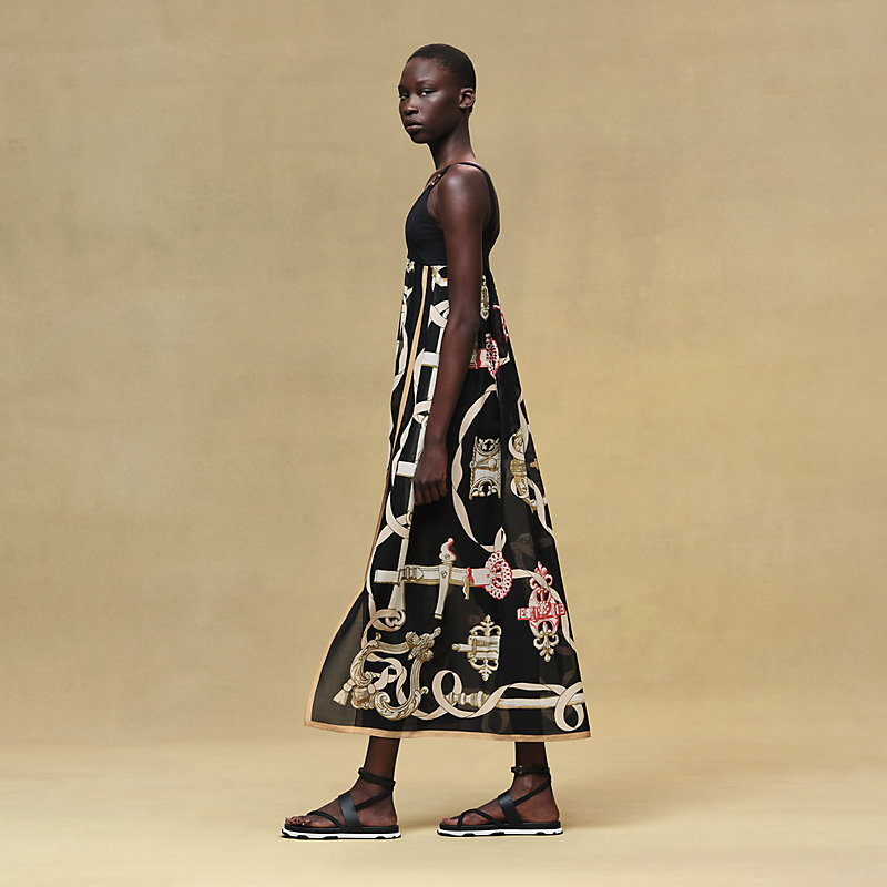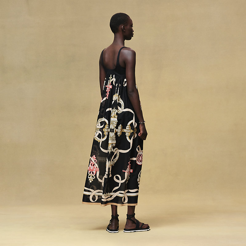 Seamlessly bridging beachwear and the allure of coastal sophistication, this cotton voile dress in the "Ferronnerie Remix" print features a quick-drying swimsuit bust and a flowing skirt, equally at ease on the Riviera coast as on a sunlit terrace.
