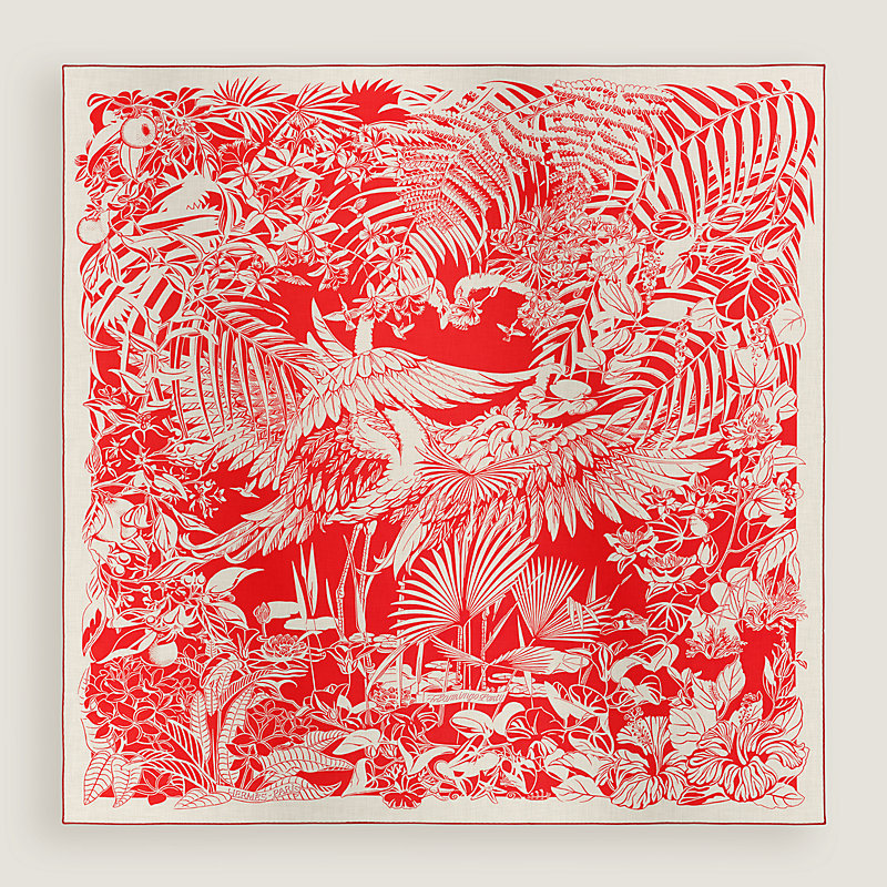 In late autumn, pink flamingos, large birds of strange beauty, embark on a spectacular courtship ritual that unites them for an entire year. Revealing their graceful necks, haughty gaits and carefully smoothed feathers, the males and females observe and brush past each other for hours on end. Two elegant flamingos pose in a graceful embrace in this scarf design, composed in 2015 by Laurence Bourthoumieux. In this tattoo version, their outstretched wings blend seamlessly with the surrounding palm leaves, orange trees and tropical flowers. The couple lovingly celebrates the land of flowers where they were born.