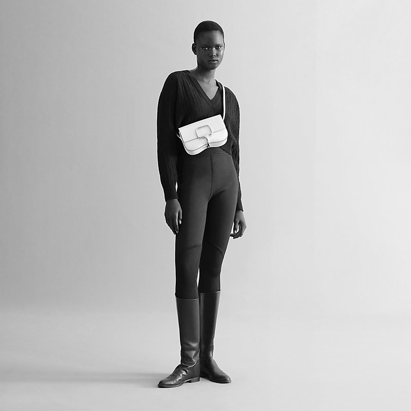 Della Cavalleria is a 17th century horse riding manual preserved at the Émile Hermès Museum, which has previously given its name to a silk scarf, and now refers to a truly innovative women's bag. Embracing the silhouette of a half bit, its jewel clasp closes the flap and shapes the curves of the bag, evoking the contour of Hermès saddles. The metal hasp on the bottom attaches the clasp to the minimalist mechanism for easy and subtle opening and closing. Thanks to an adjustable strap, the mini version of the bag can be worn on the shoulder or across the body.