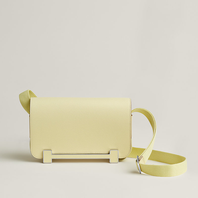 Clickety-clack is the sound made by Japanese wooden geta sandals on the ground, and of the clasp of this structured and supple bag. Its signature detail of a leather-sheathed "H", extended along its horizontal bar, serves both as a clasp, a strap adjustment system and as studs on the base of the bag, like a pedestal. With an ingenious and delicate action, the canvas strap passes through loops on each of the gussets, allowing you to wear it short or long, over the shoulder or across the body.