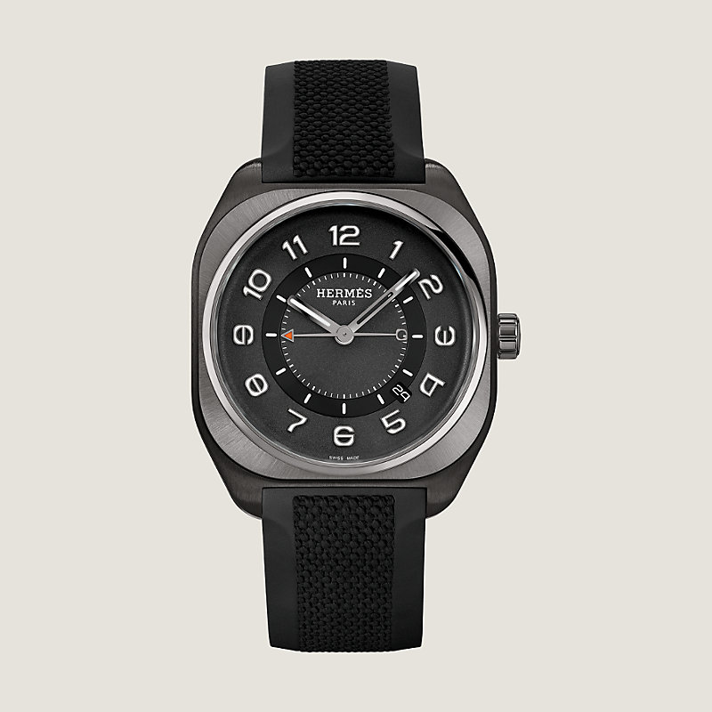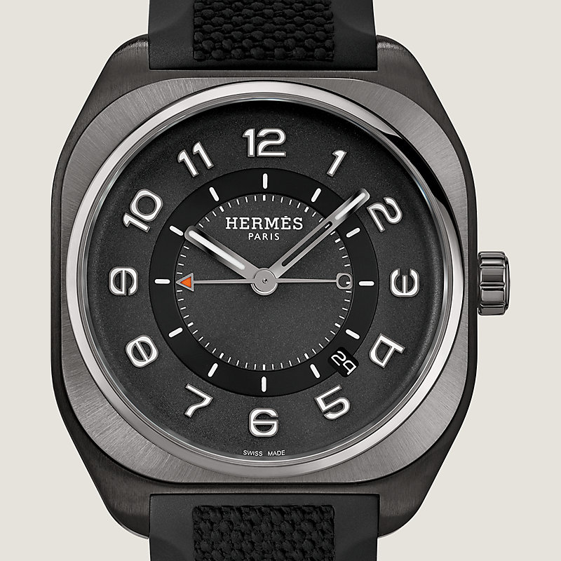 Satin-brushed titanium watch coated with matte black DLC and sunburst satin-brushed titanium bezel with mirror-polished chamfers, black-gold treated circular satin-brushed minutes disk, Hermes Manufacture movement H1837, black nickel-treated dial, grained center, strap in black rubber
