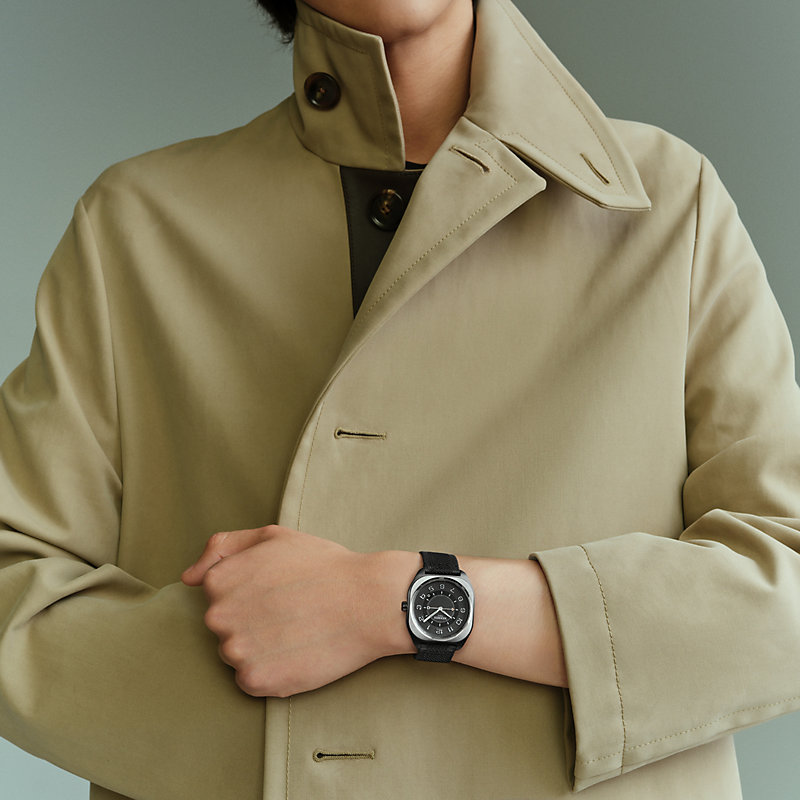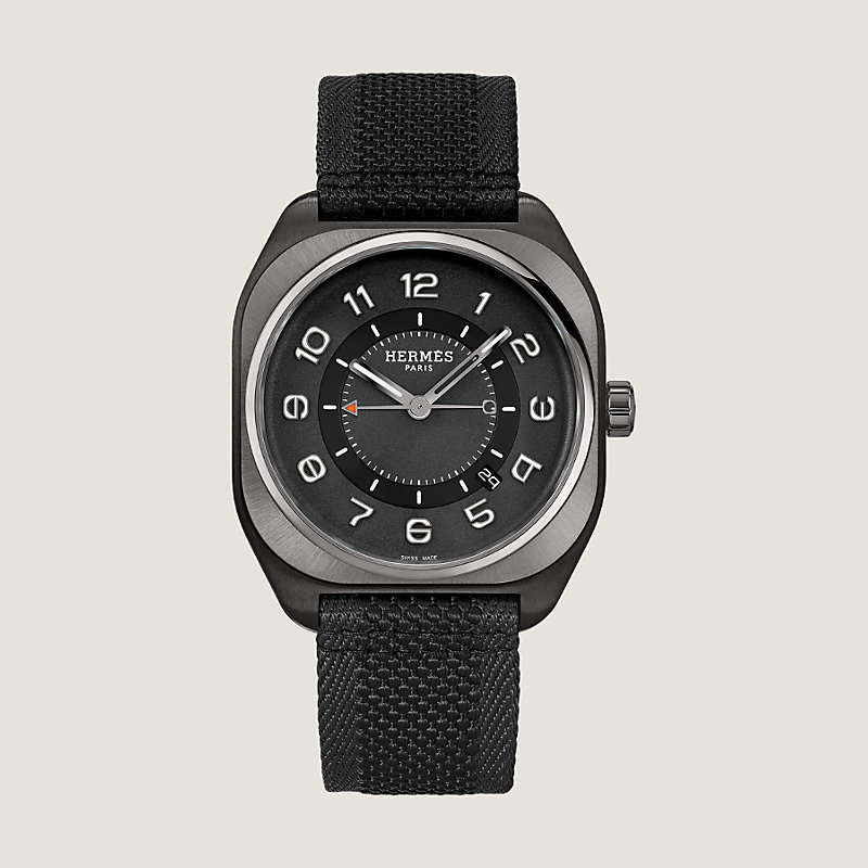 Satin-brushed titanium watch coated with matte black DLC and sunburst satin-brushed titanium bezel with mirror-polished chamfers, black-gold treated circular satin-brushed minutes disk, Hermes Manufacture movement H1837, black nickel-treated dial, grained center, strap in black fabric