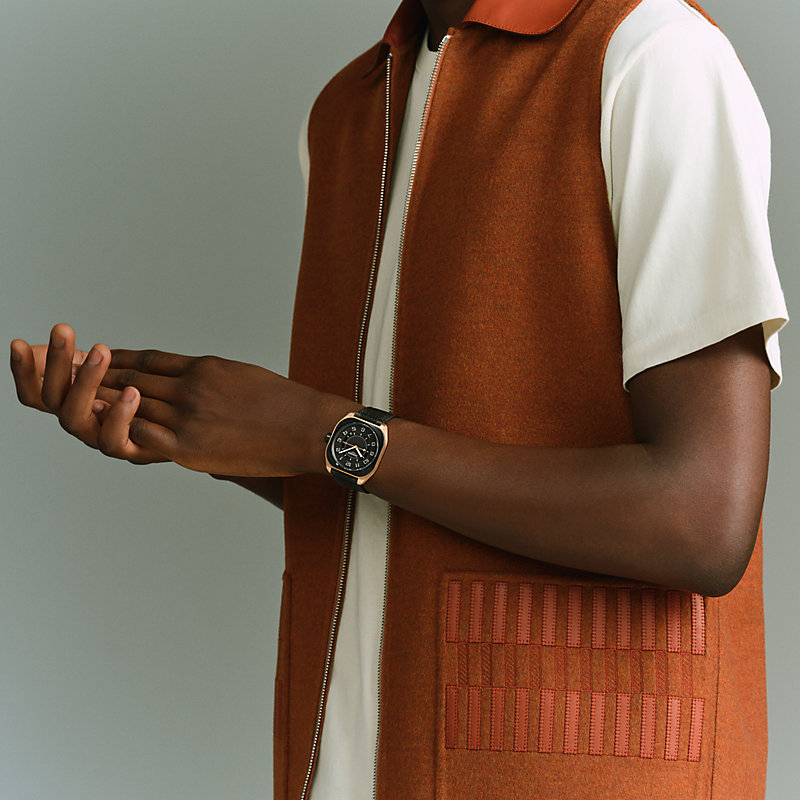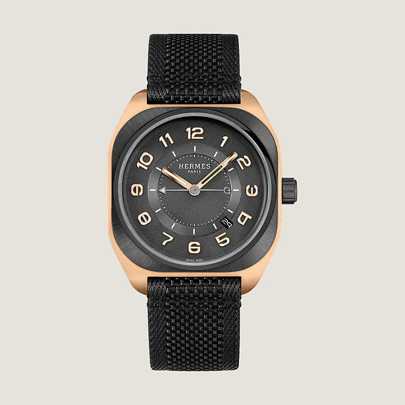 Rose gold watch and titanium back coated with black DLC, satin-brushed ceramic bezel with mirror-polished chamfers, Hermès Manufacture movement H1837, black gold-treated dial and blackening, strap in dark grey and black fabric