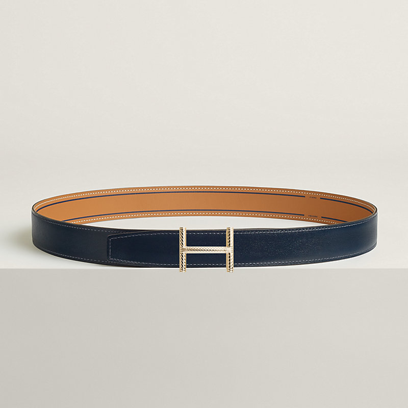 & Reversible leather strap in printed Swift and Box 135 calfskin. The Contrast 32 leather strap features the typography used on Hermès posters from the 1930s, giving Art Deco vibes. The words "Hermès Paris" appear discreetly in the center of this stripe.