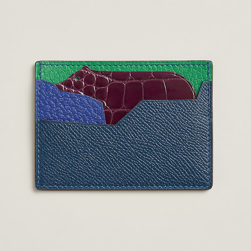 Card holder in alligator, Mysore goatskin, calfskin and Country cowhide.
