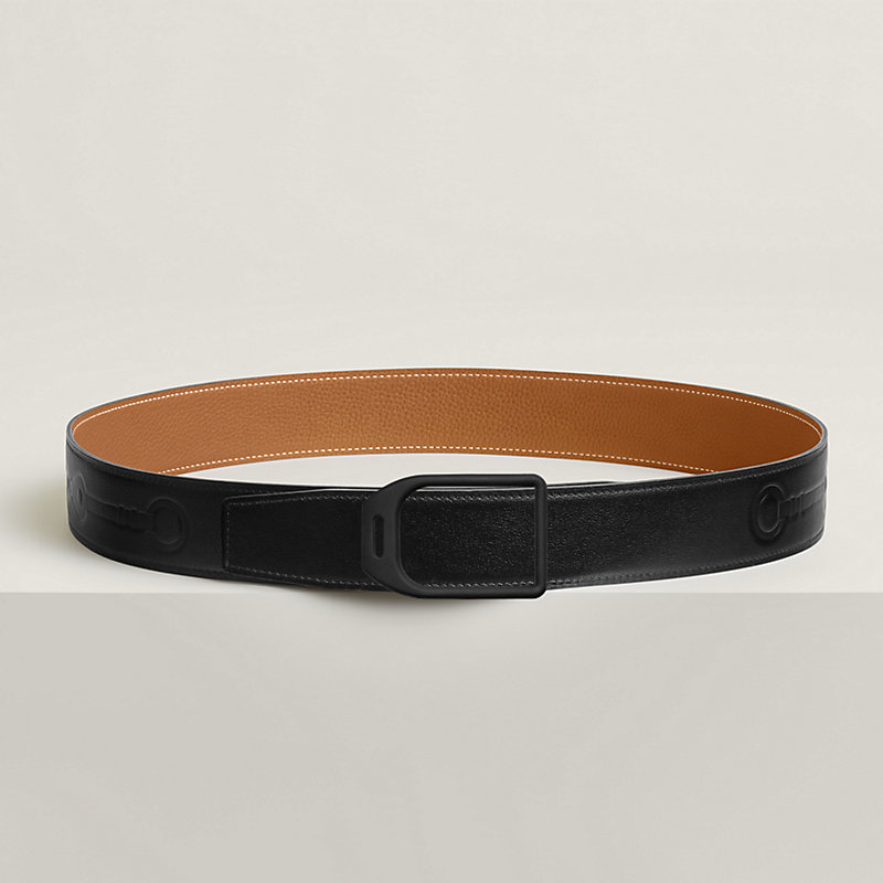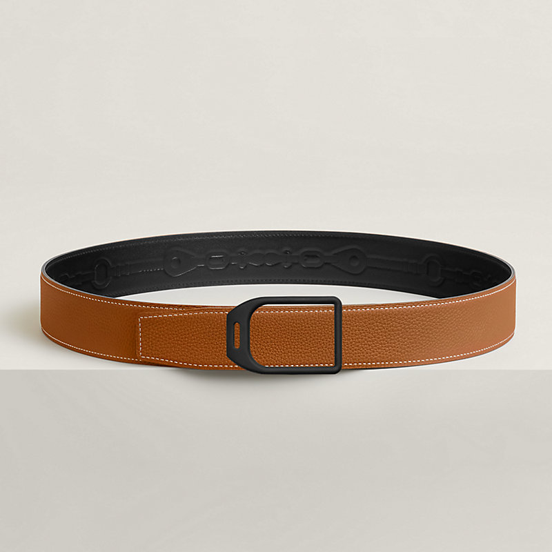 & Reversible leather strap in 135 and Togo calfskin with embossed Coaching motif, inspired by the eponymous scarf. The high-frequency know-how allows the design to be elegantly and discreetly printed on the leather strap.
