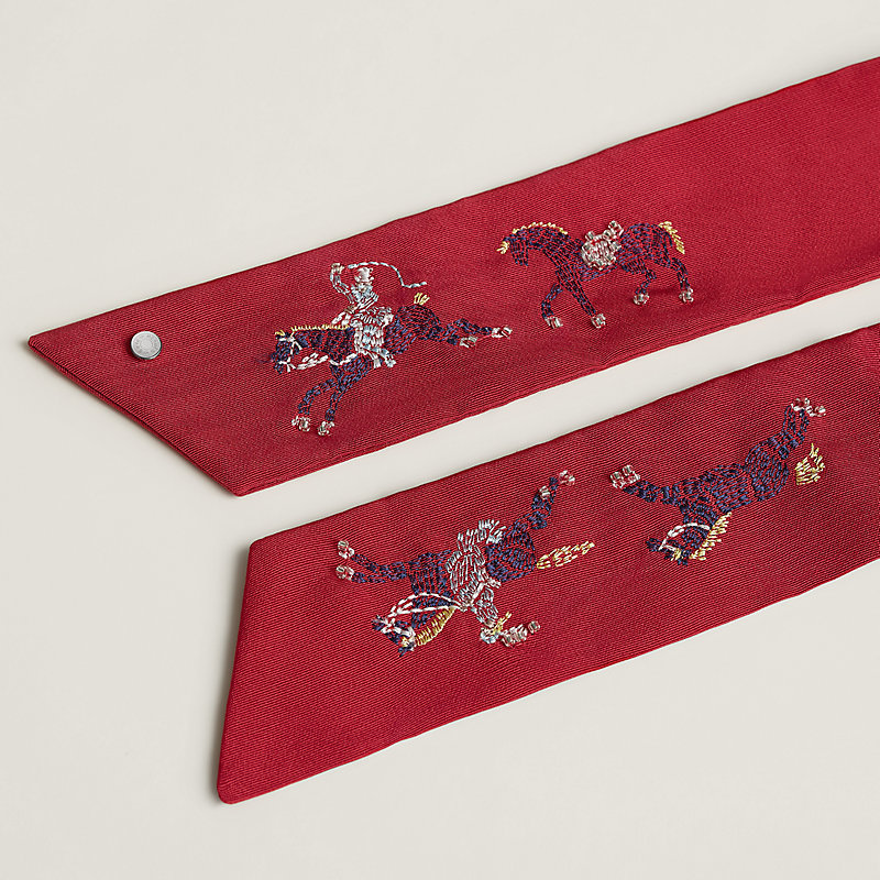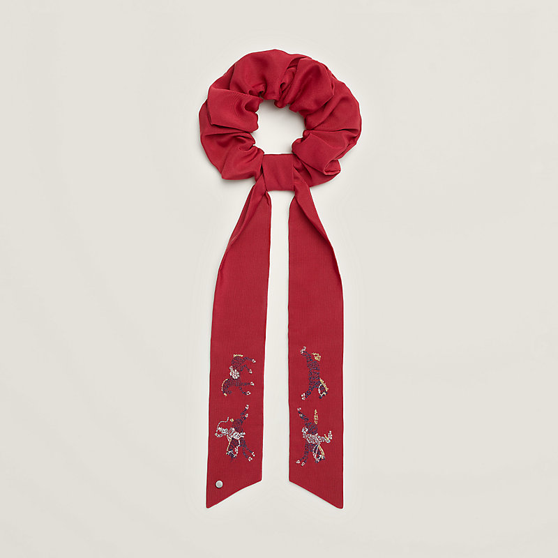 Scrunchie in silk and cotton faille with "Cheval Parade" embroidery embellished with threads and glass beads on the ribbons. Polished palladium-plated Clou de Selle signature.