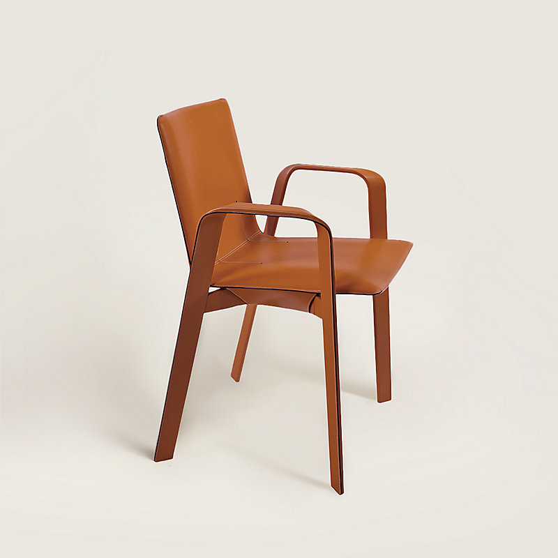 Dining chair in metal with armrests covered with saddle-stitched and polished smooth contrasting taurillon Everlisse leather