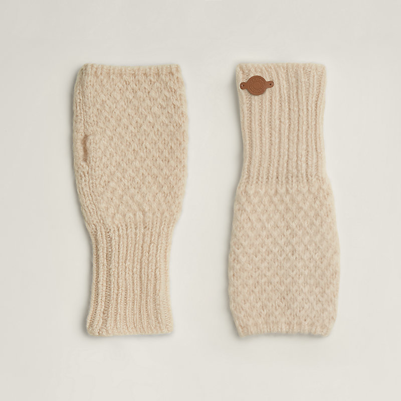 Mittens in cashmere and mohair knit with hot-stamped "Hermès Paris" patch in sanded Swift lambskin.