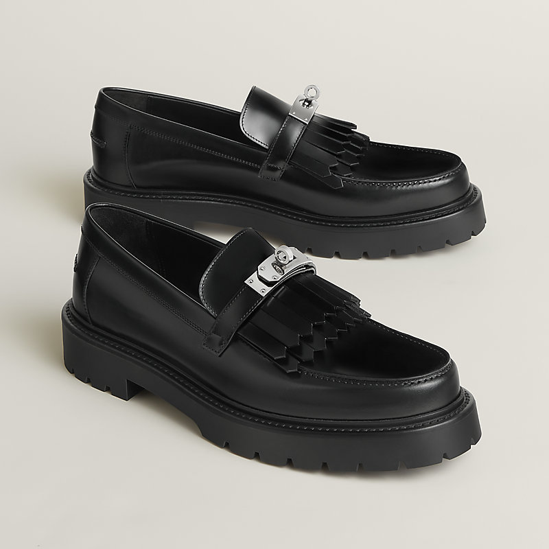 Loafer in tuscan calfskin with fringes, light notched sole and functional Kelly buckle.