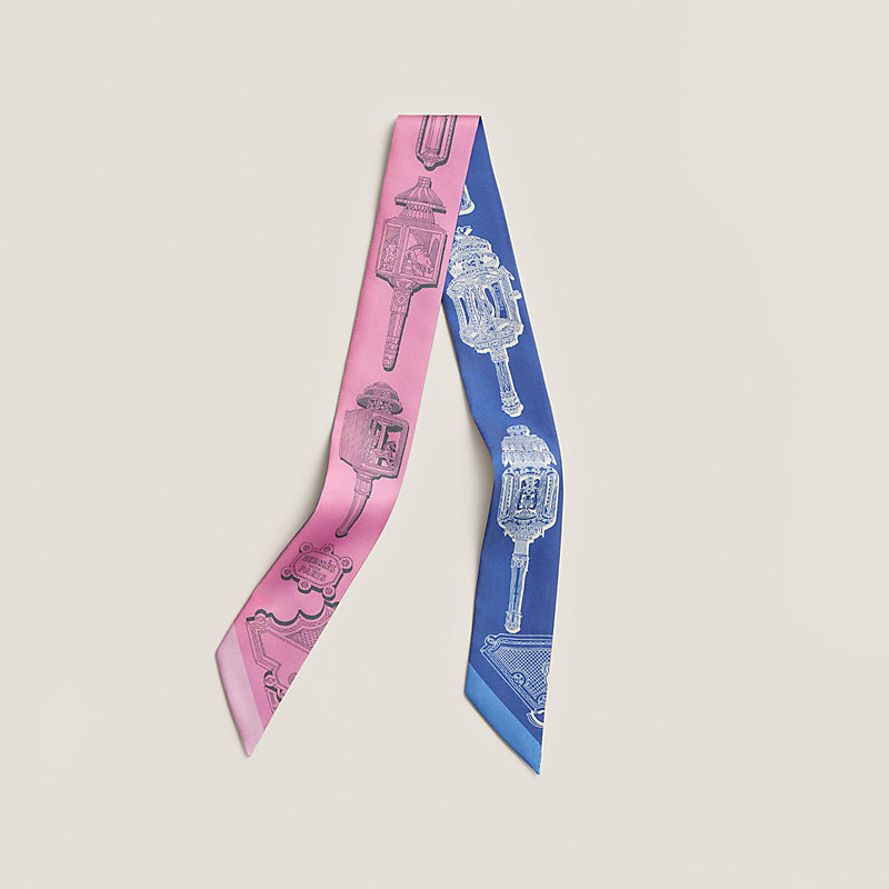 During a visit to the Émile Hermès collection, Pierre Marie stopped in front of a carriage lantern that had just been restored, struck by the refinement of its decoration. He discovered there were forty-four further examples, all different, which inspired this dynamic, diagonal scarf. He then had the idea of accentuating their originality by adding a personal touch. Each lamp becomes the theater for an equestrian scene. Horses, seahorses and chimeras dance around the light. Some form a carrousel, others pose majestically, still others are coupled with a rider. A tribute to the decorative arts, this scarf pays homage to the creativity of the horse-and-carriage craftsmen of yore.