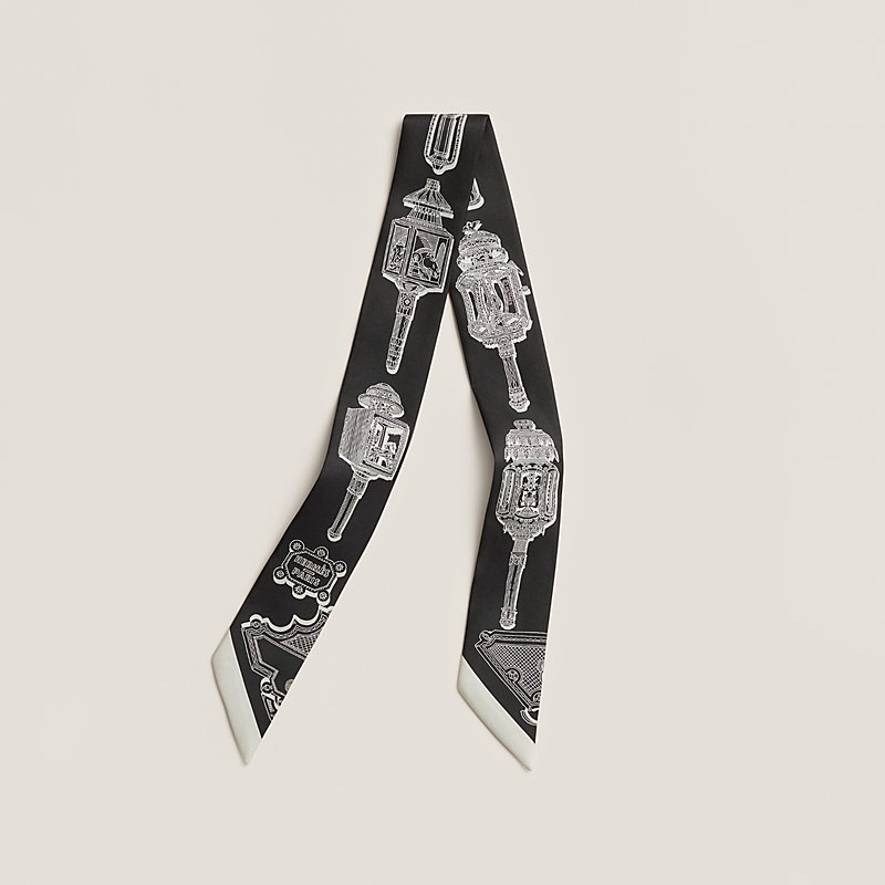 During a visit to the Émile Hermès collection, Pierre Marie stopped in front of a carriage lantern that had just been restored, struck by the refinement of its decoration. He discovered there were forty-four further examples, all different, which inspired this dynamic, diagonal scarf. He then had the idea of accentuating their originality by adding a personal touch. Each lamp becomes the theater for an equestrian scene. Horses, seahorses and chimeras dance around the light. Some form a carrousel, others pose majestically, still others are coupled with a rider. A tribute to the decorative arts, this scarf pays homage to the creativity of the horse-and-carriage craftsmen of yore.