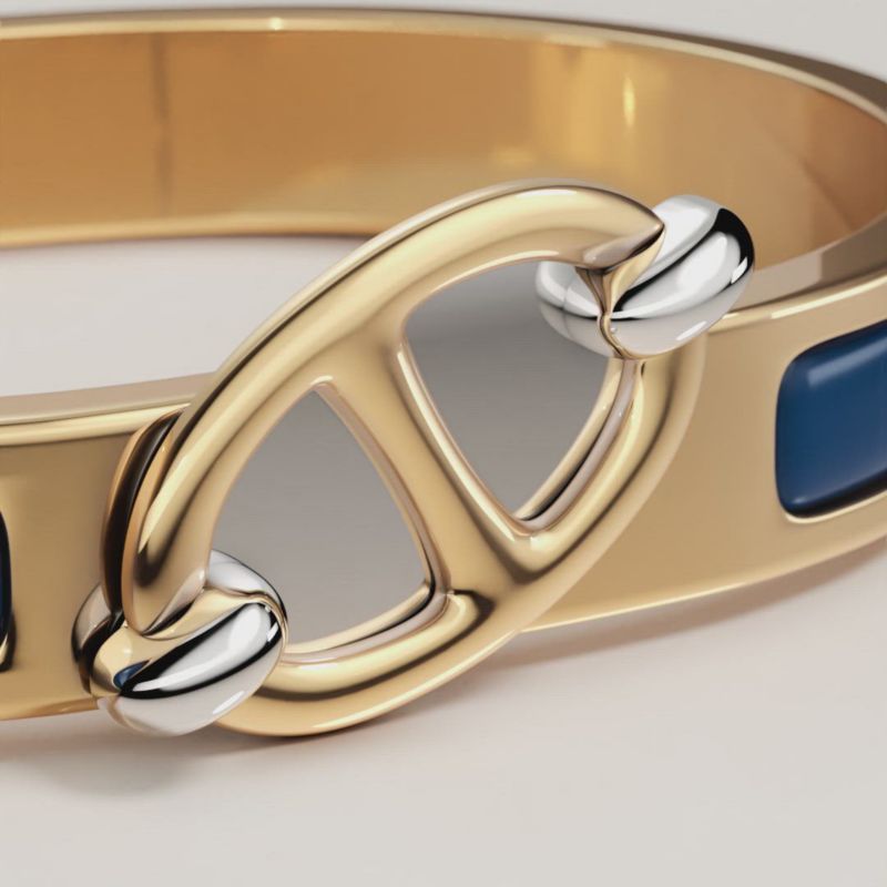 To open and close your Hermès bracelet, follow these three steps. 1. Carefully slide it over your wrist. 2. Push both ends together to close. 3. Rotate the "H" of the clasp until straight. And Click!