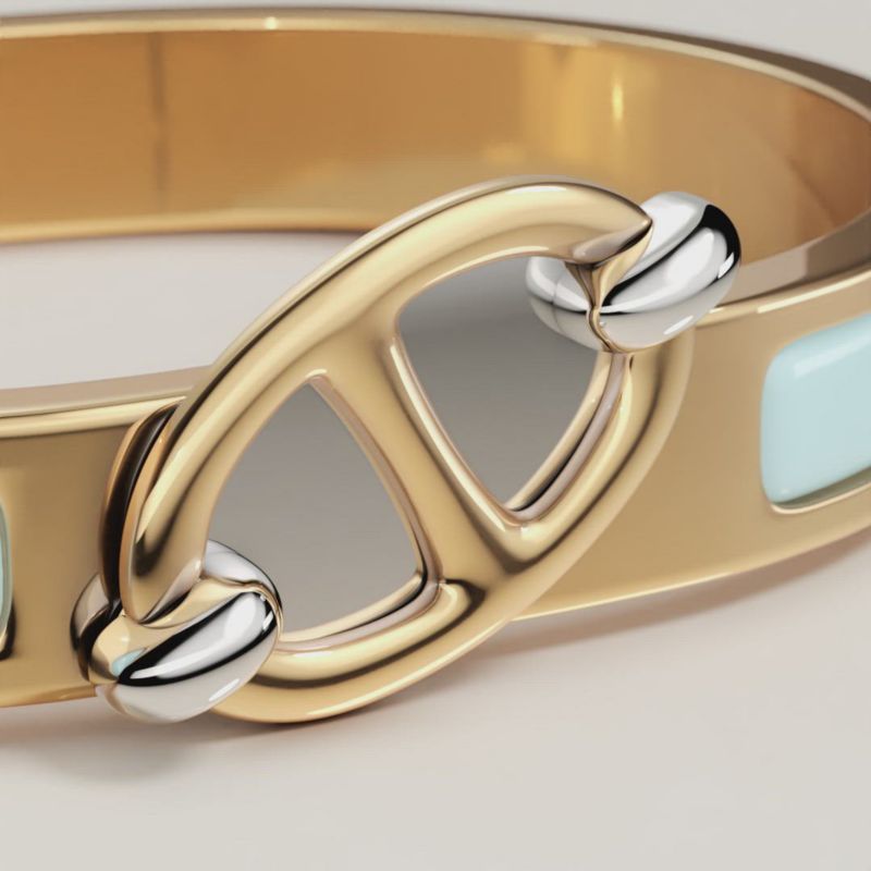 To open and close your Hermès bracelet, follow these three steps. 1. Carefully slide it over your wrist. 2. Push both ends together to close. 3. Rotate the "H" of the clasp until straight. And Click!