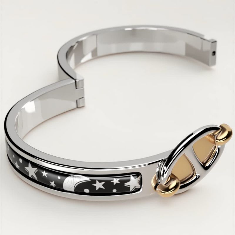 To open and close your Hermès bracelet, follow these three steps. 1. Carefully slide it over your wrist. 2. Push both ends together to close. 3. Rotate the "H" of the clasp until straight. And Click!