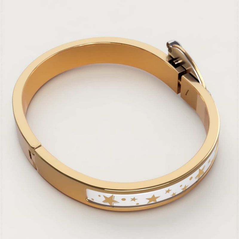 To open and close your Hermès bracelet, follow these three steps. 1. Carefully slide it over your wrist. 2. Push both ends together to close. 3. Rotate the "H" of the clasp until straight. And Click!